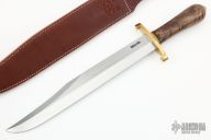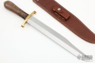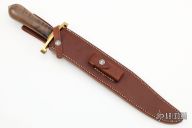 The 13" Randall Thorp Bowie by Randall Made Knives has a 13" carbon steel blade with .207" blade stock and 1.628" blade depth, hidden tang construction. The handle has a brass lugged guard, brass scalloped collar and butt cap, and a walnut grip. Comes with a brown leather sheath. Excellent condition.