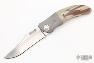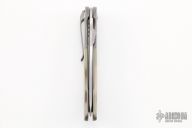 This linerlock by Allen Elishewitz features a hand rub satin finish blade with a single stepped thumbstud. The handle has titanium frame with titanium bolsters, plastic scales, and g10 backspacer. Titanium tip down clip. Strong lock up, and nice detent. Comes with original nylon sheath. Excellent condition.