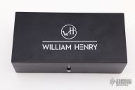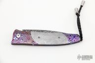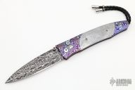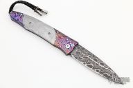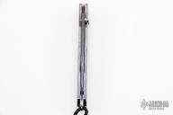 This B30 GenTac Galaxy button lock folder by William Henry Knives features an "Intrepid" Damascus blade with single thumbstud with sapphire inlay. The handle is crafted from two solid pieces of heat blued Chad Nichols MokuTi with Gibeon Meteorite inlays, sapphire inlaid push button. Includes a William Henry box, sheath and certificate of authenticity dated October 17, 2017. This piece is in excellent condition and shows no signs of use/carry.