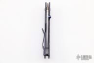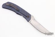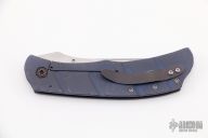 This knife by Aaron Frederick features a stonewash finished blade with a notched thumbrest and single anodized titanium thumbstud. The handle has a bead blasted and anodized titanium frame with a matching tip up clip. Nice detent, lockup and blade seating. Has some scuffs and scratches, otherwise good condition.