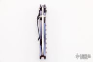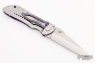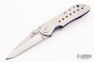 This Framelock by Allen Elishewitz features a stone wash finish blade with dual thumbstuds and notched thumbramp. The handle has titanium frame with red posts and lanyard hole in pommel. Titanium tip down clip. Blade favors the right side of the frame slightly. Comes with original nylon sheath. Has some light scuffs and scratches, great condition otherwise.