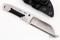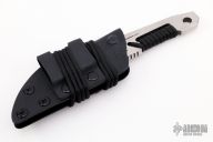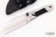 This M5 prototype from Dwaine Carrillo features a hand rub satin finished blade with notched thumbrest and 1.38" blade depth, and .27" bladesock. The handle is comprised of paracord over full tang construction. Lanyard hole in pommel with lanyard. Comes with hard case and COA. Great condition.
