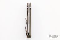 This DDC SNG by Duane Dwyer features a drop point chisel ground blade with thumbhole, and dual thumbstuds. The handle has a milled g10 scale and anodized titanium frame with an anodized tip up clip. Has some light scuffs on the blade and handle otherwise excellent condition.