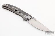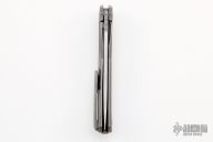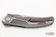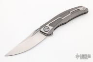This Quantum Gen2 by Shirogorov features a blasted blade with notched thumbrest and flipper. The handle has a blasted and milled titanium frame, backspacer, tip up titanium clip with hidden screws. Rides on MRBS, nice detent, lockup and blade seating. Comes with SOE Belt sheath. Has a couple light scuffs and scratches, otherwise great condition.