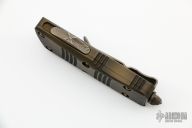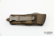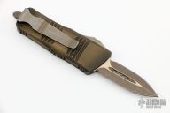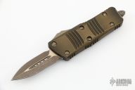 This Troodon Mini OTF automatic by Microtech knives features a bronze apocalyptic finished double edged blade, and a bronzed apocalyptic aluminum handle with bronze apocalyptic finished hardware, tip down clip, and glass breaker. S/N 089. Dated 07/2021. Comes with original box and papers. Excellent condition.