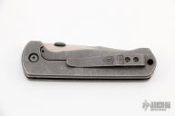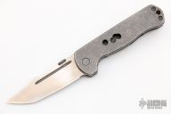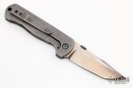 This FTRV5 framelock is a collaboration between Jeremy Horton and Brian Fellhoelter. Features a Horton ground, bronze tumble finish blade with a thumbdisc. The frame and pocket clip are stonewashed titanium with a micarta backspacer. Very smooth function with a strong lock up, nice detent and blade seating is center. Comes with a zippered case. Has some light wear on the blade finish, and some marks on the blade spine. Great condition otherwise.