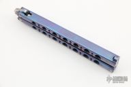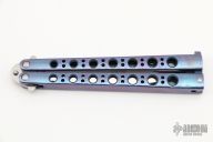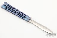 This Model 46A-01 balisong by Benchmade is a limited edition Number 018 of 250. The blade is a single edge spear point blade with polished tumble finish. The handles are orange peel finished and anodized titanium with a matching T-latch. Comes with oirginal box, sheath and papers. Excellent condition.