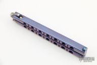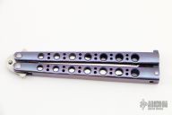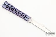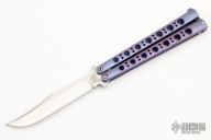 This Model-43 by Benchmade features a tumble finished clip point blade with false top edge. The handles are orange peel finished and anodized titanium with a T-latch. Comes with a original box, papers and sheath. Excellent condition.