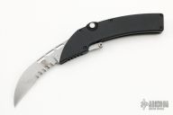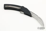 This Arc Angel by Rob Dalton features a bead blasted hawkbill style blade. The handle is comprised of black anodized aluminum with charging tab. Has some scuffs and some staining on the blade, otherwise good condition.