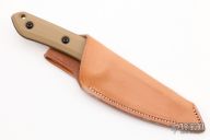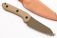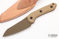 This knife features a brown cerakote blade with a notched thumbrest and a full tang construction. The handle features tan G-10 Scales. Includes a brown leather sheath, COA and the original box. Blade Steel: Magnacut. Excellent Condition.