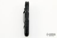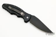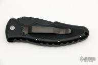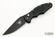 This is an ATKO 8 side opening auto with black aluminum handle and rubber inserts, black tip down stainless steel clip. Black blade. Finger grips and notching around handle for sure grip. Has a few light scuffs, otherwise excellent condition. Comes with a nylon belt sheath.