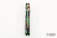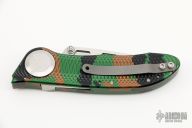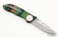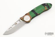 RARE! Only production D/A ever made by Rob Dalton. This side-opening D/A features a two tone blade with bead blast grinds and satin flats, and milled aluminum frame. Frame is anodized. Bead blast clip. Lift-to-fire tab release and liner lock closing. Strong and fast coil-spring opening and smooth manual action. Excellent condition. Comes with a nylon belt sheath.