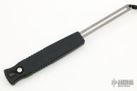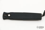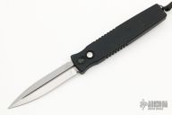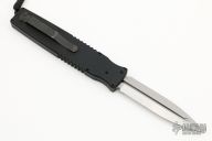 This is a push button single action automatic by SWAT double-edged spear point blade with bead blast finish. T6 black aluminum handle with hatched pattern milling, tip down stainless steel clip. Blade is retracted by depressing button and pulling recharge handle in the butt. Slide safety. Has a few light scuffs, otherwise excellent condition. Comes with original box. Dated 9/9/2000