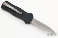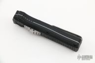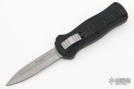 This 3350 Mini-Infidel by Benchmade features a bead blasted, double edge dagger style blade with fullers. The handle has a black anodized aluminum frame, ramped steel thumb slide and steel tip down clip. Includes original box, papers and nylon sheath. Has some scuffs, scratches and stains on the blade, otherwise good user condition.