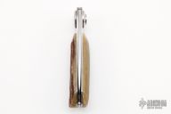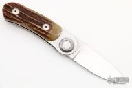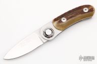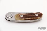 Made by Peterson Precision Engineering and marketed by Gerber, the Paul knife was introduced in 1996 and discontinued in 1997 with a total run of about 23,000. This folder has an axial locking mechanism and a handle scale of stag. This knife was assembled by hand. Excellent condition in the original box, very nice piece.