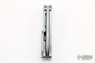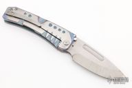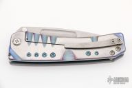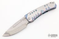 This Midi Marauder from Medford Knife and Tool features Vulcan finished drop point blade with fullers.  The handle has a satin and anodized titanium frame with a tip up clip over satin barrel spacers. Nice detent, lockup, and seating. Has a few light scratches, excellent condition otherwise.
