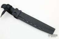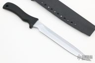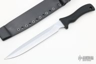 This Shrike 8 by MadDog Knives has a hard chromed, double-edged blade with VVTL finish (very visible temper line) Razor sharp edges with a type 1 choil, the black handle material is the proprietary glass / epoxy composite -- compression bonded to the hidden full tang and incredibly ergonomic. 1/4" blade stock (stout!) and 1" blade depth. Mad Dog trademark on the ricasso – it is the PERFECT knife for everyday carry. The handle is designed to be ergonomic and has the ability to withstand tremendous punishment with little or no damage. It is hard and tough enough to be used as an impact tool. Includes a kydex sheath and zippered case. Excellent condition.