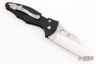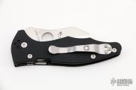 This Yojimbo 2 by Spyderco features a satin finished wharncliffe blade with thumbhole. The handle has a black G-10 frame with stainless steel liners, lock is on the spine of handle. 4-way reversible stainless steel clip. Nice detent, lockup and blade seating. Comes with original box and papers. New condition. Knife Center Exclusive.