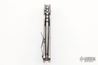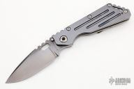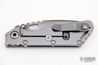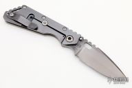 This Mick Strider Performance Series SMF framelock folder features a black satin spear point blade with thumbhole and notched thumbrest. The handle has a black satin titanium frame with titanium clip, tip up carry. Jimping on blade spine. Includes Hinderer "Lock Bar Stabilizer" for maximum reverse lock retention. Nice detent, lockup and blade seating. New from maker at the 2022 CCKS.