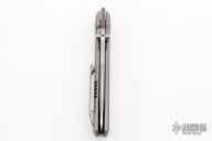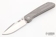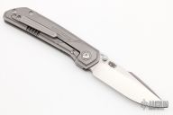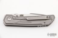 This Mula framelock by Enrique Pena features a hand rub satin finished drop point blade with swedge, notched thumbrest and dual thumbstuds. The handle has a bead blasted titanium frame with a titanium backspacer. Matching tip up titanium clip. Comes with original box. Has a couple of light scuffs, otherwise excellent condition.