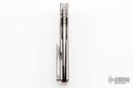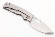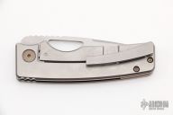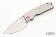 This knife by the OZ Machine Company features a tumbled Magnacut blade with thumbhole and notched thumbrest. The handle features a smooth tumbled titanium frame with an anodized titanium backspacer and tumbled tip up pocket clip with hidden screws. Includes box and papers dated 5-25-22 and s/n 744. Excellent condition.