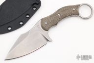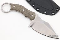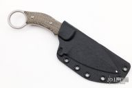 This SRambit by Fox Cutlery is a Borka Blades design, it features a stonewashed blade with false top edge and notched thumbrest, .197" blade stock and 1.609" blade depth, full tang construction with black canvas micarta scales. Comes with kydex sheath with belt clip and original box. New condition.