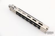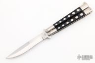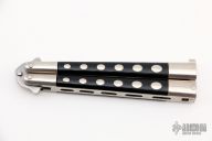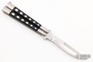 This International Series Weehawk Balisong has a satin finished stainless steel blade with false top edge (marked 1985). Handle is steel with black plastic inlays. Comes with nylon sheath. Has scratches, otherwise good condition.