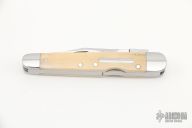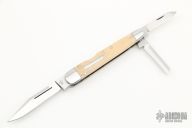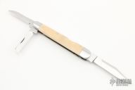 This 3-Blade Lockback Whittler by Doc Hagen features hand rub satin finished blades with nail nicks. The main blade is a lockback and the two smaller blades are slipjoints with half-stops. The handle has stainless steel bolsters, liners, springs, pins and escutcheon, mammoth ivory covers. Main blade is .200" thick. Comes with a zippered case and hand written COA dated 2012. It is also noted on the COA that this is a copy of a Tony Bose/Case Lockback Whittler. Has a few very light scratches, otherwise excellent condition.