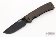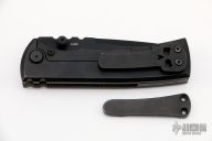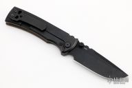 This Chaves Ultramar Redencion drop point features a black finished blade with the Chaves logo, dual thumbstuds, and notched thumbrest. The handle is made up of green canvas micarta and black titanium, skull pocket clip (positioned for tip up carry), and a matching titanium backspacer. Has overtravel stop. Blade is centered when closed, and locks up with no play. Comes with box and additional clip. Has some light scratches, otherwise excellent condition.