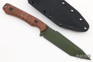 This Angry Man Tanto by Frank Landau III features a green tanto blade with a notched thumbrest, ..224" blade stock and 1.276" blade depth, full tang construction. The handle textured vintage paper micarta scales with black screws. Comes with a C4 Industries kydex sheath with TekLok. New from maker!