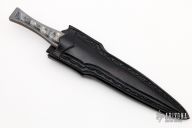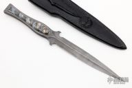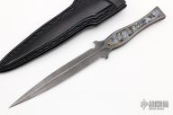 This dagger by Billy Mace Imel features a double edged Damascus blade, .289" blade stock and .764" blade depth, full integral construction with mammoth tooth inlays. Excellent grinds and finish work. Great feel in the hand. Comes with a hand tooled black leather sheath by Tree Stump Leather. Excellent condition.