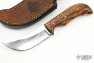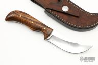 This Skinner by Bock Blades features a hand rub satin finished blade with .167" blade stock and 1.108" blade depth, full tang construction. The handle has wood scales with brass pins and white liners. Comes with a brown leather sheath by DeeKae's Leather. Excellent condition.
