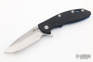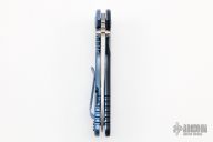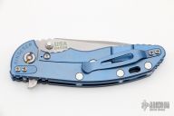 This XM-18 Spanto by Rick Hinderer Knives features a stonewash S45VN finished blade, notched thumbrest and flipper and dual thumbstuds. The handle has a stonewashed and blue anodized titanium frame with a black G-10 scale, anodized titanium hardware. Clip can be mounted for tip up or down carry. Nice lockup, seating, and detent. Comes with a Hinderer box and extra hardware. Excellent condition.