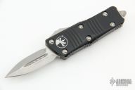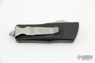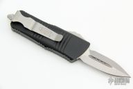 This Troodon Mini OTF automatic by Microtech knives features a stonewash finished double edged blade, and a black aluminum handle with bead blasted hardware, tip down carry. Glass breaker. S/N 2071. Dated 04/2021. Comes with original box and papers. Excellent condition.