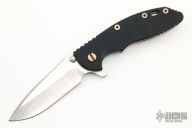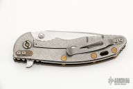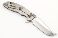 This Custom XM-18 by Rick Hinderer features a satin finished hand ground blade with notched thumbrest and flipper. The handle has a black/blue G-10 scale, copper liner, tumbled titanium frame and clip, lanyard hole at the butt, anodized titanium hardware. Nice detent, lockup and blade seating. Comes with original box, two extra G-10 scales, original hardware and liner. Has some light scratches, otherwise excellent condition.