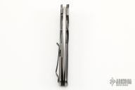 This Tanto Flipper by Jason Clark features a satin finished tanto blade with a false top edge and checkered flipper. The handle has a zirconium dovetailed bolster, carbon fiber scales over a tumbled titanium frame, checkered stainless steel backspacer, and a tip up titanium clip. Runs on IKBS bearings. Nice detent, lockup and blade seating. Amazing flipping action. Includes a zippered case and a gator skin case. Has a few scuffs and scratches, otherwise good condition.