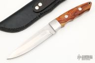 This early fixed blade by Allen Elishewitz features a hand rub satin finished laminated steel blade with .186" blade stock and 1.087" blade depth, full tapered tang construction. Daryl Meyer Steel. The handle has dovetailed stainless steel bolsters, wood scales. Comes with a black leather sheath. Has some light scratches, otherwise excellent condition.