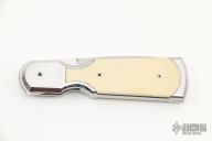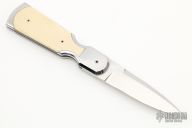 This PTT Dead Bolt Locking Knife by Ron Richard features a hand rub satin finished blade with swedge. The Handle features a polished stainless steel frame with two mammoth ivory liners. Very smooth action. Blade is centered when closed and locks up with no play when open. Has some light scratches, otherwise excellent condition. Comes with a zippered case. Marked "RON RICHARD 6" inside backspacer