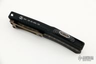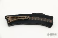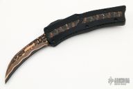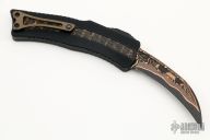 This Custom ROC by Heretic Knives features a hand ground hawkbill Baker Forge Tiger GoMai San Mai Damascus blade with fullers and notched thumbrest. The handle has a black aluminum chasis with Brass/Copper Snakeskin Fat Carbon inlays, tip down bronze titanium clip with ceramic ball. Brass/Copper Snakeskin Fat Carbon inlay in the push button. Comes with original box and COA #051 and dated 8/22. Excellent Condition.