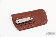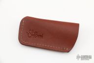 This Micro brown leather sheath by SoulBound Leather is made from premium full grain English Bridle Leather from Wickett & Craig and has a stainless steel pocket clip. New from maker. 3.5" tall and 1.5" wide. It will fit a knife 3-3.5" in length closed, and 0.75-1" in width. Not to exceed 0.375" in thickness.