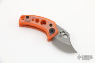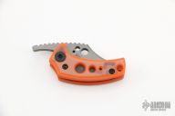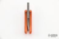 This Wasp Friction Folder by Koch Tools features a chisel ground tumble finished blade with swedge, notched thumbrest and friction bar. The handle is comprised of camo orange G-10 scales over a titanium barrel spacer. Lanyard hole in pommel. Excellent condition.