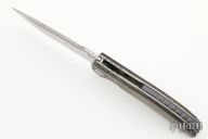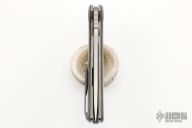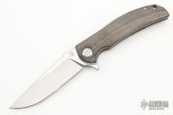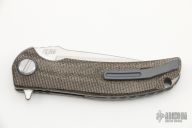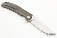 This Soft Overkill by Shirogorov and RJ Martin features a M398 blade with notched thumbrest and a flipper. The handle has a blasted and milled titanium frame, green canvas micarta scales, anodize finish titanium pivot collars, backspacer and tip up clip with hidden screws. Has RBS, nice detent, lockup and blade seating. #034/300. Comes with original box and papers.  Excellent condition.