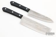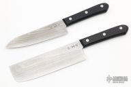 This set of Suminagashi Usuba and Petit Gyuto Hocho Kitchen Knives By Kansui Ink Pattern Kitchen Knives feature 16 layer stainless Jigane forged on a Cobalt steel core, Paaka wood handles. Kansui Ink Pattern/Suminagashi knives feature a Jigane, which is made by repeatedly folding together two layers of different types of stainless steel. This unique process creates a stainless Jigane with 16 exceedingly thin, alternating layers, called Damascus. The Jigane is then forge-welded to both sides of a stainless cobalt steel core and tempered to Rockwell c63º. This process creates a blade of great beauty and strength. The addition of cobalt and manganese to the high-carbon steel core greatly increases durability and ease of sharpening. These knives are perfect for restaurant and heavy home use. They will never tarnish or rust. Pakawood handles are riveted to the full length tang. Each blade comes razor sharp.