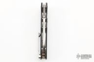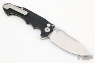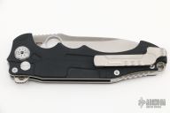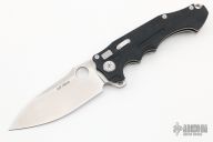 This Pitboss 1 by Andre De Villiers features a drop point blade with thumbhole, notched thumbrest and flipper. It swings smoothly on a ball-bearing system and has both a thumb hole and flipper opener; it can also be opened or closed with a flick of the wrist when the inlaid button lock is held down. A safety switch on the side allows the blade to be locked in the closed position or provides an additional level of safety in the open position. It has a g10 handle with satin hardware. A jimped, anodized titanium backstrap with a lanyard hole and a tip-up, titanium pocket clip with hidden screws. "SL-33" on the ricasso. Has some light scuffs and scratches, great condition.