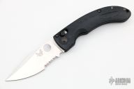 This Benchmande 746 Lum Mini Onslaught Axis Lock folder has a tumble finish clip point blade with thumbhole. The handle is comprised of black G10 over black stainless liners, black fiber backspacer, stainless steel clip, and lanyard hole. Comes with original drawstring pouch. Has a couple light scuffs, excellent condition otherwise.