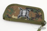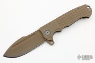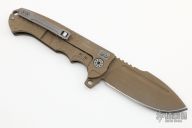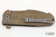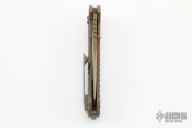 This ADV Harpoon F-17 framelock flipper has a Barrett brown Cerakote blade with swedge, fullers, notched thumbrest and flipper. Handle has a brown coated titanium frame, titanium backspacer and black tip up clip with roller, satin finished hardware. Rides on bearings, nice smooth action, detent, lockup and blade seating. Comes with nylon zippered case. Has some light scuffs and scratches, great condition otherwise.