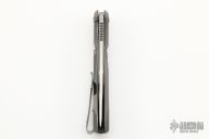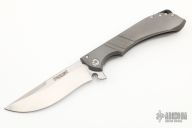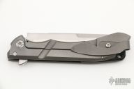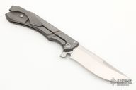 This Alchemy Mid-Tech by Dervish Knives features a tumble finished recurve blade with swedge, notched thumb rest and flipper. The handle is comprised of a tumbled titanium frame over a black G10 backspacer with lanyard bail. Tumble finished, tip up deep carry clip is positioned for right hand carry. Includes padded velcro case. Excellent condition.