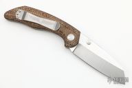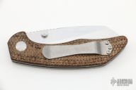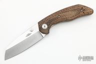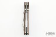 This Model 75 from Jesse Jarosz has a satin finished blade with dual thumbstuds and a notched thumbrest. The handle has barb wire micarta scales with tumbled titanium liners and black G-10 backspacer with lanyard pin, tumbled tip up titanium clip. Nice crisp detent, tight lockup, and centered blade seating. Comes with a Velcro case. Excellent condition.