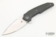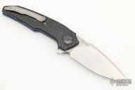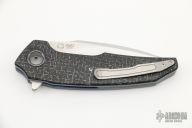 This Tashi Bharucha designed flipper by Andre Thorburn and Andre van Heerden features a spear point hand rub satin finished blade with a false top edge, notched thumbrest and flipper. The handle is comprised of silver lightning strike carbon fiber scales with zirconium picot collars and pivot, anodized titanium liners, silver lightning strike carbon fiber backspacer, tip up titanium clip. Includes a velcro case and COA dated November 2019. Nice detent, lock up and blade seating. Excellent Condition.