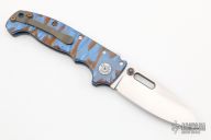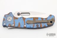 This AD20 by Andrew Demko features a hand ground hollow satin finished blade with notched thumbrest, thumbhole and dual thumbstuds.  The handle has an anodized titanium frame with a tip up anodized titanium clip and "Shark" lock release on the spine. Comes with original box and zippered case. MagnaCut Blade. Excellent condition.